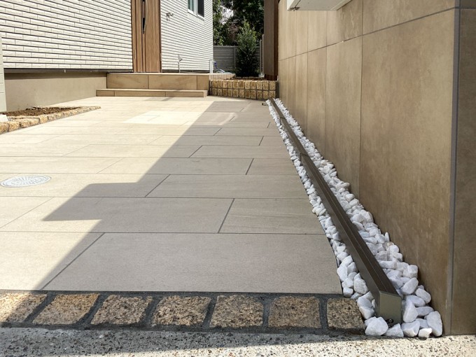 洗い出しの土間からスタイリッシュな玄関へと続くアプローチ。